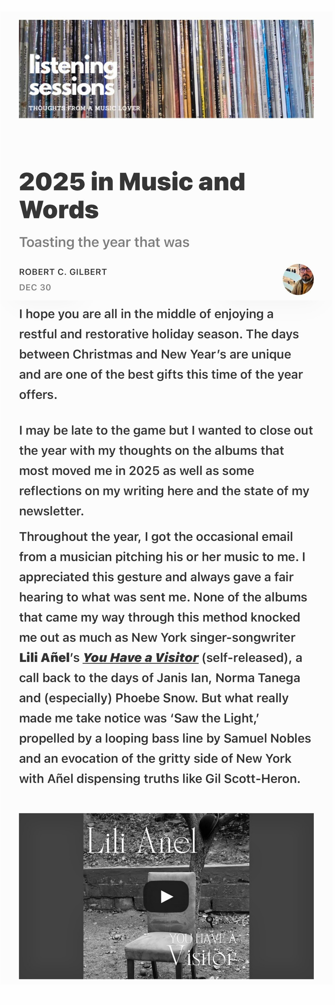 Music writer Robert C. Gilbert, from Listening Sessions, toasted 2025 after digesting a whopping 507 new albums! Then he narrowed it down to the ones that stood out and wrote a very favorable essay about Lili's latest release.