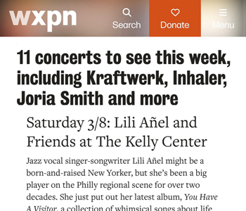 ![]() March 5, 2025 "WXPN Mention" WXPN mentions Lil's upcoming March 8th show along with a link to "Anymore" from her latest album YOU HAVE A VISITOR... Read More |